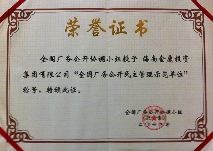 10月28日,金鹿集團公司被全國廠務(wù)公開協(xié)調(diào)小組授予“全國廠務(wù)公開民主管理示范單位”榮譽稱號,是海南省兩個示范單位之一。